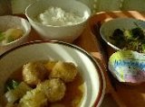 | 昼食 | ・ご飯 ・鶏肉団子のあんかけ ・サラダ・ おつけ物 ・プリン |