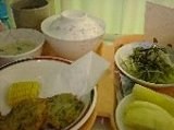 | 夕食 | ・ご飯 ・野菜サラダ ・薩摩揚げととうもろこし ・スープ ・りんご |