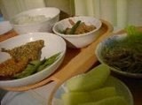 | 夕食 | ・ご飯 ・鰺フライ ・枝豆 ・野菜の和え物 ・蓮根の煮物 ・りんご |