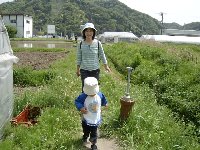 | ビニールハウスは2カ所に分かれています。ひとつは道路沿い、そしてもう一カ所はこんな水田の横のあぜ道を歩いた向こうにあります。近くに見える山々、そして田植えが終わったばかりの水田。あぜ道には花がたくさん咲いていて、本当にのどかな風景です。主人は「ここを歩いているだけで、休日〜っていう気分が盛り上がってきた」と言っていました。田舎育ちの私は、どちらかというと懐かしいという気分だったのですが、こんな空気を吸うのは久々で、やっぱり休日気分が盛り上がってきました。初めてあぜ道を歩くしゅんは、土の感触にニッコリ。何度も振り返って笑っていました。お食事エプロンも身につけて、いちごを食べる準備も万端です。 |