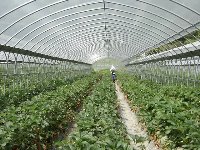 | まずはこのビニールハウスに入ってみることにしました。ご覧の通り、私たち家族の貸し切り状態です。 最初はしゅんと手をつないで、ソロリソロリと歩いていたのですが、「あ、いちご、ここにもいちご〜」とすっかり舞い上がった私は、ズンズン進んでいつの間にかしゅんから遠ざかり・・・。それでも「いちご、たべゆ〜」としゅんは必死でついてきて、主人だけがポツリと残された様です。 |