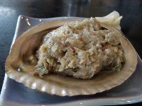 | 白い船を横目に見ながら、ショップの建物に入りました。左右にお土産やさんが並び、真ん中には生け簀が置かれていて、様々な魚介類が売られていました。さざえやホタテ、蛤などなど、「これ買っていってバーベキューしようよ」というお客さんの声が聞こえてきましたが、新鮮でおいしそう!と私も思いました。 眠たいのかお腹が空いたのか、ベビーカーを思う存分押せなかったのが気に入らないのか、ご機嫌斜めのしゅんが私に抱っこされながら暴れていましたが、「あ〜、おいしそう」「わ〜、食べたいねぇ」と言いながら、見て回りました。まだあと1泊残っているので生鮮品は買えない私たちは、これまたもねさんに教えて頂いた「落花生の甘納豆」をお土産に買いました。 |