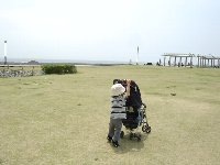 | 芝生の広場に戻り、ベビーカーをぐんぐん押すしゅんです。馬が見られる公園ももちろんいいけれど、こんな風に海が見られる公園もいいな〜と思いながら、気持ちの良い空気をいっぱい吸い込んで車に乗りました。 |