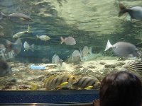 | ぐるりとまわるスロープを下りていくと、「無限の海」と名付けられた大きな水槽の前に出ます。ぐるりと下りていったのは、この水槽の一番上から下まで下がっていったということだったのです。見上げるほどの高い水槽の中で、大きな魚たちがスイスイと泳いでいます。 大人もジーッと魅入ってしまうような光景ですが、しゅんもあっちへこっちへと泳いでいくお魚にみとれていました。 ちょうどフーディングショーの時間になったので、そのまま見学することにしました。ウェットスーツを着たお姉さんが、それぞれの魚用に用意されたえさを持って、水槽に入ってきました。まずは小さな魚用、次に少し大きな魚用と、えさをパーッと広げるたびに、対象の魚がパクパクと食事を始めます。これは一日に一度のショーだったようですが、ちょうど良いタイミングでした。 ずっと前に2度ほど来たことがあり、またいつか来たいと思っていたシーワールドですが、こうしてしゅんと訪れることができて嬉しかったです。海がすぐそこにあるので、シャチのショーなどはまるで海に向かって飛んでいってしまうのでは・・・というような迫力があります。最近行った動物園でも感じましたが、水族館でも水の中の生物の様子を興味深く観察できるように色々と工夫されるようになったのではと思いました。 |