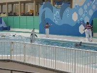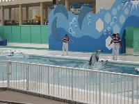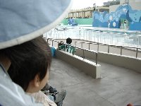 | パンフレットのショー開催時間のスケジュールを見て、あちこちのスタジアムを移動します。私たちは、まず「サーフスタジアム」に行き、イルカのショーを見ました。時間ギリギリだったため、もう観客席はほとんど満席!端の方の席に座って、ショーが始まるのを待ちました。 こんな風にショーを見るのは初めてのしゅんは、訳がわからず「あっち行く」と早くも帰りたそうにするのでドキドキ・・・。目の前には今回のショーに出ないイルカさんたちがスイスイ泳いでいたのですが、それも目に入らない様でした。 |