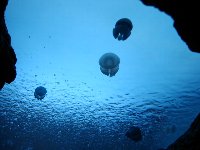 | 最後にトロピカルアイランドに入りました。これは小さなコーナーに作られていた、クラゲの水槽です。青い水の中、ぷかぷかと浮かぶクラゲは、とても幻想的です。 |