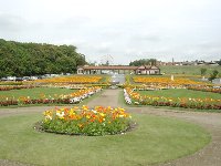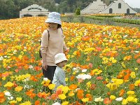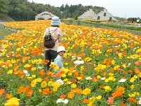| 入り口近くのフラワーガーデンに戻って、お花畑の中を歩きました。「お花摘み」の看板を見つけて行ってみると、「10本200円」という貼り紙とお金を入れる箱が置かれていました。 この旅行では、できたらお花摘みをしたいと思っていましたが、できそうな場所を通るのは2日目だから無理かなとあきらめていたので、すっかり嬉しくなってイソイソと摘み始めました。以前ポピーを摘んだ時は、きれいだなと思って咲いている物を混ぜて摘み取りました。でもポピーは、早ければつぼみもその日の夜には開き始めるということがわかったので、今回は、これは一体何色だろう?と思いながらつぼみだけを摘み取りました。 |