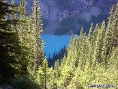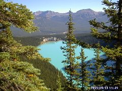 | 9月13日 自由行動の今日は、レイクルイーズ周辺で過ごすことにしました。JTBの係員さんがおっしゃっていた通り、正面の山に朝日が当たって朝のレイクルイーズはとてもきれいでした。少し散歩した後、ホテルから向かって右側にあるハイキングコースに行くことにしました。このハイキングコースはレイクアグネスへ続いています。木々の間を登っていくと、所々でレイクルイーズが見えます。近くで見るよりずっと深い青色の湖です。 |