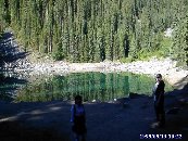 | ビッグビーハイブに向かって出発です。なぜかここからは人が少なくなってきました。見渡しても私たち二人だけ・・・そこでJTBの係員さんが何度も何度もおっしゃっていたことが急に頭に浮かんできました。それは、「レイクルイーズの周辺は熊がでますからね。先週も出たし、とにかく人がいないときは危ないですよ。声をだして人間がいるということを熊に教えてあげてください。」というお言葉です。急に恐ろしくなった私は「あー、うー。」と大声をあげながら進みましたが、いつまでたってもビッグビーハイブには着かないし、人はいないしということで、もう引き返すことにしました。はるか下に見えたレイクルイーズがとてもきれいでした。 |