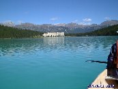 | ホテルに戻ってお昼ご飯を食べた後、レイクルイーズでカヌーをすることにしました。救命胴衣を付けて、湖の上に。初めてのカヌーでしたが、湖はとても穏やかで揺れることも全くなかったので、すぐに遠くまで漕いでいくことができました。湖がとても近くて気持ちよかったです。 |