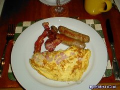 | 9月14日 朝食は毎日「ポピー・ルーム」でとりました。バイキング形式ですが、卵料理はコックさんに注文してその場で作ってもらうことができました。オムレツの具を何種類もの中から選ぶことができます。写真はチェダーチーズとハムとマッシュルームを入れたオムレツです。正直言ってこれだけでおなかがいっぱいでした。日本人向けなのでしょうが、賽の目のお豆腐とがりが並んでいたのがおかしかったです。 |