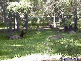 | ボウ滝からボウ川沿いの道を歩いていると、エルクの群れが草を食べているところを見ることができました。ほんの5メートル位先にこんなにたくさんのエルクがいるという状態にすっかり興奮してしまい、しばらく動くことができませんでした。この群れには1匹の雄とその他多数の雌と子どもがいるということです。雄は角が立派でとても大きかったです。 |