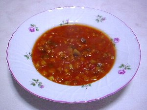 | 作り方 | ・野菜をすべて5ミリ角に切る ・オリーブオイルをひいたおなべに野菜を入れ、少々炒める ・ホールトマトと水とチキンコンソメを入れる ・トマトをつぶしながらコトコト煮る ・クレイジーソルトと黒コショウで味をととのえる |