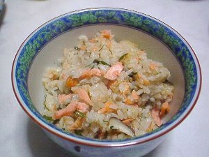 | 作り方 | ・少な目の水加減にしょうゆと酒を入れ、きのこをのせて炊く ・鮭を焼いて、細かくほぐしておく ・大葉を細い千切りにしておく ・炊きあがったご飯を軽く混ぜ、鮭と大葉と白ゴマを入れて混ぜる |