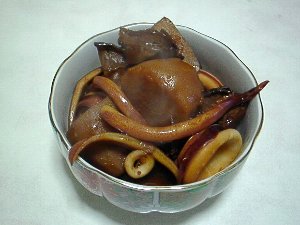| 作り方 | ・干し椎茸をもどしてもどし汁をこしておく ・干し椎茸のもどし汁の中に調味料を入れ、煮立たせる ・イカを食べやすい大きさに切って煮汁の中に入れる ・落としぶたをして色がかわるくらいまで煮て取り出す ・里芋と干し椎茸を煮立った煮汁に入れて30分くらい中火で煮る ・イカを入れて5分くらい煮る |