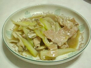 | 作り方 | ・一口大に切った豚肉にしょうゆと酒をもみこみ、片栗粉をまぶしておく ・セロリと舞茸を一口大に切る ・フライパンにごま油を熱し、豚肉、セロリ、舞茸の順に炒める ・中華スープを入れ、強火で炒める ・仕上げ前にしょうゆ小1弱を入れる ・水溶き片栗粉でとろみをつける |