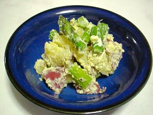 | 作り方 | ・サツマイモは柔らかくなるくらいにゆでる ・最後は粉ふきいもの要領で、水分を飛ばす ・熱いうちにスプーンなどでつぶしておく ・アスパラガスを、固めに塩少々でゆでる ・サツマイモとアスパラガスを適量のマヨネーズで和える ・粒こしょうを多めにふって味を調えたら出来上がり |