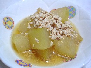 | 作り方 | ・冬瓜を食べやすい大きさに切る(皮は薄くむく) ・お鍋にごま油をひいて鶏ひき肉をぽろぽろになるまで炒める ・冬瓜を入れて全体的に軽く混ぜる ・ひたひたに水を入れる ・あくを取りながら中火から弱火でゆっくり煮込む ・冬瓜が透き通って色が付いてきたら、火を止めて少し置く ・食べる前にあたため直して出来上がり! |