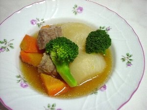 | 作り方 | ・豚肉はかたまりのまま、水とショウガと酒と一緒にお鍋にいれる ・沸騰したら弱火にして、1時間くらい火にかける ・人参を乱切り、かぶを半分に切る ・ブロッコリーをゆでておく ・豚肉を取り出し、3〜4センチ角に切る ・スープを漉し、浮かんだ油を取る ・お鍋にスープを戻し、塩、酒、しょうゆを入れて沸騰したら弱火にする ・豚肉と人参を入れて10分くらい煮る ・かぶを入れて5分くらい火にかける ・火を止めてゆっくりと味をしみこませたら、出来上がり! |