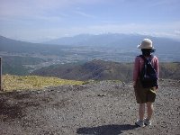 | 写真ではよく見えませんが、遙か彼方に富士山が見えました。小さくうっすらとしか見えない富士山が、見慣れた富士山とは違ってもっと幻想的に感じられました。 山頂なので、風が強い!マウスオーバーすると、風が吹いてきますよ! |