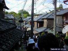 | 二年坂をぶらぶらと歩きました。おみやげ物やさんが並んでいます。八つ橋を焼いているお店もあります。八つ橋ソフトクリームというものも売っていましたが、ちょっと勇気がなくて食べられませんでした。 |