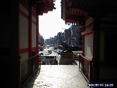 | 八坂神社の中を通って四条通りに戻りました。八坂神社から四条通りを眺めたところです。一直線に広い道路が走っています。 |