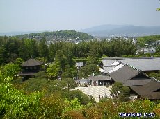 | お庭を見ながら順路に従って歩いていくと、京都市内を見渡せる高台に出ます。銀閣寺と砂のお庭が下に見えます。とても手入れが行き届いたお庭ですが、「ハブに注意」という看板があちこちにありました。でるんでしょうか・・・? |