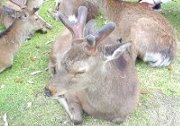 | 登大路を東大寺に向かって歩きました。興福寺を過ぎた辺りから、鹿があちこちに座っています!鹿せんべいを売っているお店も何軒もあったので、早速1束150円で買いました。 お昼過ぎだったからか、観光客が多いからか、お腹がいっぱいでもう眠たいよ・・・と言いたそうな鹿がいっぱいです。東大寺近くになるととても元気のいい若い鹿がたくさんいて、おせんべいに向けて自ら食べにくる鹿までいました。 |