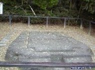| 左が鬼の雪隠、右が鬼の俎(まないた)です。この付近は霧ヶ峰と呼ばれ鬼が霧を降らせて通行人を迷わせ、捕らえて俎で料理しては、雪隠で用を足したという伝説があるそうです。実際には、古墳の石室の底石と蓋石だということが解明されています。雪隠は野道のすぐ脇にあります。俎は野道から少し上がったところにあります。鬼がこの俎で料理して・・・と想像した方が、何となくおもしろく感じます。 |
