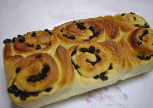 卵と牛乳が入ったリッチな生地のパンです。ホットケーキを作った時に買ったはちみつ入りメープルシロップが余ってしまいそうだったので、これをパンに混ぜたらおいしそうだなぁと作ってみました。カレンズとシロップをくるくると巻き込んで、輪切りにした生地をパウンド型に入れて十分発酵させて焼きました。ふんわりふくらんだおいしそうなお菓子パンができあがりました。