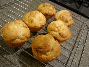 | 簡単レシピ | 薄力粉・・・80グラム 全粒粉・・・30グラム 卵・・・1個 無塩バター・・・60グラム BP・・・小さじ1 砂糖・・・40グラム 牛乳・・・60cc くるみ・・・30グラム 白胡麻クリーム(市販品)・・・小さじ1強 バターを柔らかくした後、砂糖をすり混ぜます。 卵を少しずつ加えてよく混ぜます。 牛乳とふるった粉類をゴムべらでさっくり混ぜます。 小さくしたクルミを全体に混ぜます。 白胡麻クリームを加え、ざっくり混ぜます。 マフィン型6個に入れ、180度で26分焼きます。 |