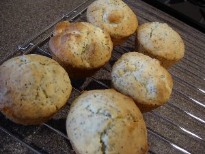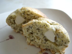 | クリームチーズとポピーシードのマフィン | ずっと以前から、お菓子やパンを焼かれる方のHPでよくお名前の出る「たかこさん」の「何度も試作してようやくたどりついた ほんとうに作りやすい焼き菓子レシピ」という本が気になっていました。本屋さんで見かけた時もお写真のかわいらしさやおいしそうなお菓子の数々に惹かれたのですが、まだまだ私には技術が・・・と買うのをためらっていました。でも最近よくオーブンでお菓子やパンを焼くようになったこと、「おさんぽ猫通信」のもこさんからこの本にあるマフィンがおいしかったと教えて頂いたことでぐぐぐっと購入熱が高まって、GWだし!とちょっぴり気が大きくなって思わず手にとってしまいました。 ちょうど材料が揃ったので、早速もこさんもご推薦のこのマフィンを焼いてみました。とても扱いやすい生地で、噂通り手順はとても簡単でした。焼き上がりはほんのり茶色でおいしそう。パクリと一口食べてみると、皆さん仰っている様に、ほんのり甘い生地と少ししょっぱいチーズ、そしてぷつぷつというポピーシードの弾ける感じがとても不思議で、一口、もう一口・・・と後引くおいしさでした。ポピーシードはまだたくさん残っていることですし、また何度も作りたくなる様なマフィンでした。(主婦と生活社 「ほんとうに作りやすい焼き菓子レシピ」より) |