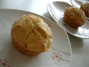 | クルミとチーズのマフィン | 朝ご飯が無かったので、すぐに作れるものは・・・と本をパラパラめくって、今日もマフィンを焼きました。私がキッチンの棚を開ける音を聞きつけると、「またシャカシャカ(粉ふるい)する?」とおもちゃを置いてピューッと走ってきたしゅんと一緒に、シャカシャカと粉をふるったりバターを混ぜたり。マフィンは簡単な材料で気軽に作れるのがいいなといつも思います。 お菓子というより少しご飯風にと思い、クルミをたっぷりとシュレッドチーズを入れてみました。チーズは真ん中の辺りにパラッと混ぜ、てっぺんにもパラリとかけてあります。ローストしたクルミの香ばしい香りと、とろけるチーズの塩味がおいしいマフィンになりました。マフィン型1枚にぴったりのレシピなのですが、一人2個ずつあっという間にお腹に入ってしまいました。(主婦と生活社 「ほんとうに作りやすい焼き菓子レシピ」のマフィンの配合で) |