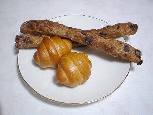写真上:ドライフルーツスティック、下:バターロール
