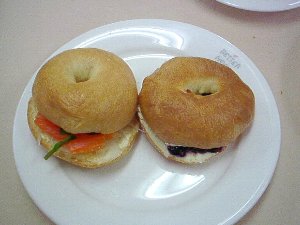 | ベーグル | 小麦粉とサラダ油だけのシンプルなパンです。発酵した後、10秒くらいお湯でゆでてから焼くパンです。 このパンは元々ユダヤ人が作り始めたということです。ゆでてから焼くという変わった作り方には理由がありました。焼き菓子には税金がかかった時代、何とか税金を払わずに売れないものかと考え、少しだけゆでて焼き菓子ではない!ということにしたそうです。す、すごい・・・。 クリームチーズをたっぷりぬって、スモークサーモンやブルーペリージャムと一緒に食べました。焼きたてはぱりぱりでとってもおいしかったです。 |