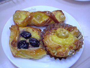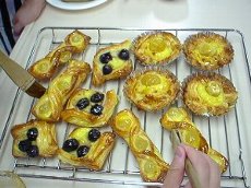 三種類のデニッシュペストリーを作りました。デニッシュ生地を、工作のようにあれこれ成形していきました。それぞれ違う形にして、カスタードクリームの上に果物を乗せました。 焼き上がってから、アプリコットジャムとブランデーを混ぜたものをたっぷりと塗りました。(下の写真はその時のものです)つやつやと光ってとてもおいしそうになりました。 栗のデニッシュペストリーは、成形するときに余った生地のきれはしなどを、細かく刻んでカップにいれたものです。残さず大事に使って、一つ別のパンができあがるのがとてもいいなぁと思いました。 お味は・・・感激のおいしさでした! |