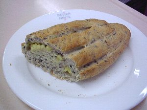 | セサミブレッド | 生地に黒ゴマをたくさん混ぜてあります。パンの中にはプロセスチーズの細かな角切りのものをはさんでいるので、焼きたてはチーズがちょっぴり溶けて、またちがったおいしさでした。 噛みしめる度にゴマの風味がして、やわらかなパン生地とともに、とてもおいしいパンでした。 |