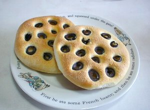 素朴なお食事パンで、どんなお料理にもぴったりではないかと思いました。上に乗せる黒オリーブをハーブやにんにくスライスに変えてもおいしいそうです。