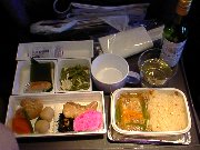 | 機内食です。左は離陸後1時間半くらいで出た昼食です。和食を選んだら、思ったよりとてもおいしくてびっくりしました。右は着陸2時間前くらいの軽食です。映画を観たり音楽を聴いたりしているうちに、パリ、シャルルドゴール空港に到着しました。 |