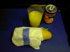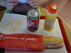 | パリでの乗り継ぎは2時間ほどです。空港はとても明るくて清潔なイメージでした。何か食べようかと思い、写真のパンとジュースを買いました。パンはハムがはさまれた「パリジャンサンド」、ジュースはコーラとオレンジジュースです。パリジャンサンドはパンの皮がパリパリでさすが、フランスという感じでした。1本が大きくておなかがいっぱいになりました。オレンジジュースはつぶが入っていましたが、オレンジというよりみかんの味がしました。 |