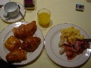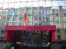 | 8月13日 今日はジュネーブで一日過ごします。上の写真はホテルの朝ご飯です。何種類ものパンやハムやチーズがとてもおいしかったです。ゆっくり朝食をとるのが大好きな私たちは、毎朝ほとんど1番に行ってのんびりしていました。 このホテルは「ラマダホテル」だったはずなのですが、到着したときには「ノヴォテルホテル」になっていました。確か何年か前は「フォーラム」だったはず・・・。というわけで、まだ入り口もホテル名は消されていました。このホテルに何があったんでしょうか? |