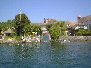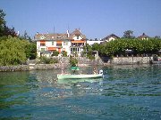 | 私たちが乗った船は、あちこちの小さな船着き場に止まりながら、ローザンヌまで行くようでした。とりあえず、電車で帰れるところで下りようと決めて、船を楽しみました。レマン湖沿いには、お城のような別荘らしい家がたくさん建っていました。どのおうちも素敵でした。写真左の様に、ボートに乗って上半身はだかになり、つりを楽しむ人々や、湖で泳ぎを楽しむ人々がたくさんいました。思い思いに夏の一日を楽しんでいるようでした。 |