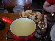 | ジュネーブ駅からバスで旧市街まで行き、「シャレースイス」というお店でフォンデュを食べました。このお店では、フランス語しか話せない店員さんと、つたない英語の私たちとで、会話するのがとても大変でした。フォンデュも一人前だけ注文したら、本当にその量で大丈夫?と心配されたので、じゃあ、二人前ということで注文したのが右上のフォンデュです。白ワインと干し肉とフォンデュはとっても「トラディッショナル」だよ、とほめてもらいましたが、この昼食のおかげで夜ご飯も食べずに朝まで寝てしまうことになるとは・・・。 |