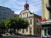 | 写真左は街角にあった教会の様な建物です。右はとってもカラフルな絵が描いてある市電です。まだ6時頃でしたが、一日中歩き回ってお昼ご飯をいっぱい食べたせいですっかり疲れてしまい、早々とホテルに戻って夕ご飯も食べずに寝てしまいました。夫は12時ごろに起きて3日目に行く予定だったベルンの予習を一人でしていたようですが、私が起きたのは朝の6時でした!ライトアップされた大噴水を見に行く夢は・・・ほんとの夢の中にいたのでした。 |