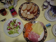 | 8月14日 今日はジュネーブを出発し、ベルン観光をしてインターラーケンに向かいます。また一番乗りで朝食のレストランに行って、ゆっくり朝ご飯を食べました。スモークサーモンやハムやチーズがおいしかったので、フランスパンとフルーツが入ったパンをスライスして、オープンサンドを作りました。左下は部屋の様子です。とてもきれいなお部屋でした。 |