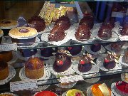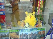 | 写真左はおもちゃやさんにあったピカチューのぬいぐるみです。右はケーキやさんのディスプレイです。ハリネズミのようなチョコレートを使ったケーキがたくさんありました。 |