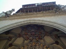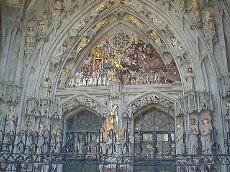 | 大聖堂です。正面入り口の彫刻です。左半分は神に選ばれた人々、右半分は地獄に落ちていく人々を表しているそうです。とても細かい彫刻で見飽きませんでした。左下の写真は小さくてよく見えませんが、上から落ちそうになっている怖い顔をした生き物です。 |