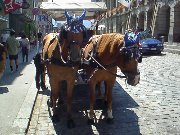 | 左上は牢獄塔です。小さい入り口を入っていくと、すぐに階段があって上ることができます。左下の写真は、かなり上までいったところから写したものです。牢獄塔の前は広場になっていて、野菜や果物の市が出ていました。右上のチャップリンの銅像は実は本物の人間です。何でこんな所に銅像があるのかなぁと思っていると、前に置いた箱にお金を入れた人がいました。すると、今までじっと動かなかった銅像が動き出しました!とっても上手な動きでした。 |