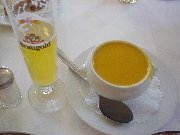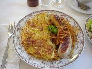 | お昼ご飯は「ハーモニー」で食べました。左上のレシュティと右上のサラダはセットメニューです。あとはビールと、今日のスープを注文しました。すごいボリュームでしたが、とってもお得なお値段でおいしかったです。 |
