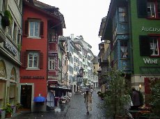 | バーンホフ通りを歩きました。大通りから、いくつもの小道がでていますが、どこもとても趣のあるかわいらしい通りです。左上は3年前の新婚旅行の時に、何も知らずに偶然歩いた道だ!と気付いてとても嬉しくなりました。右上は聖ペーター教会です。道が入り組んでいて、たどり着くのが大変でした。左下はフラウミュンスターです。 |